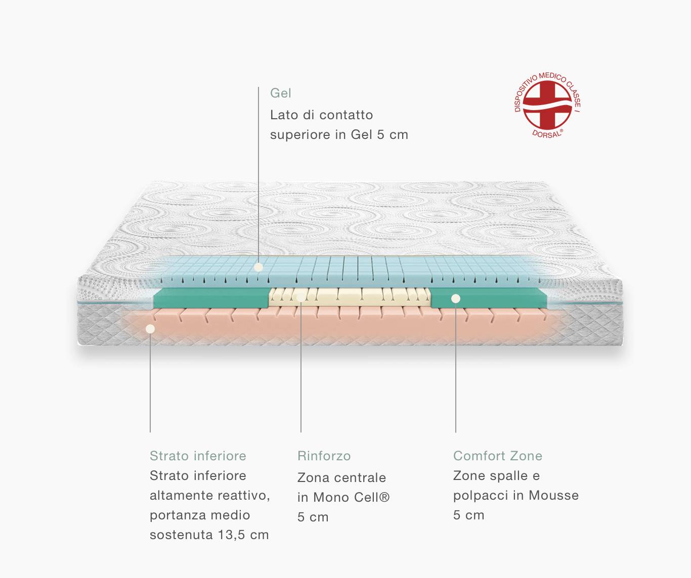 - Grazie agli strati in Gel, Mousse e Natur Memory Gel potete dire addio ai risvegli notturni per improvvisi colpi di calore e lasciarvi cullare dal comfort assoluto.